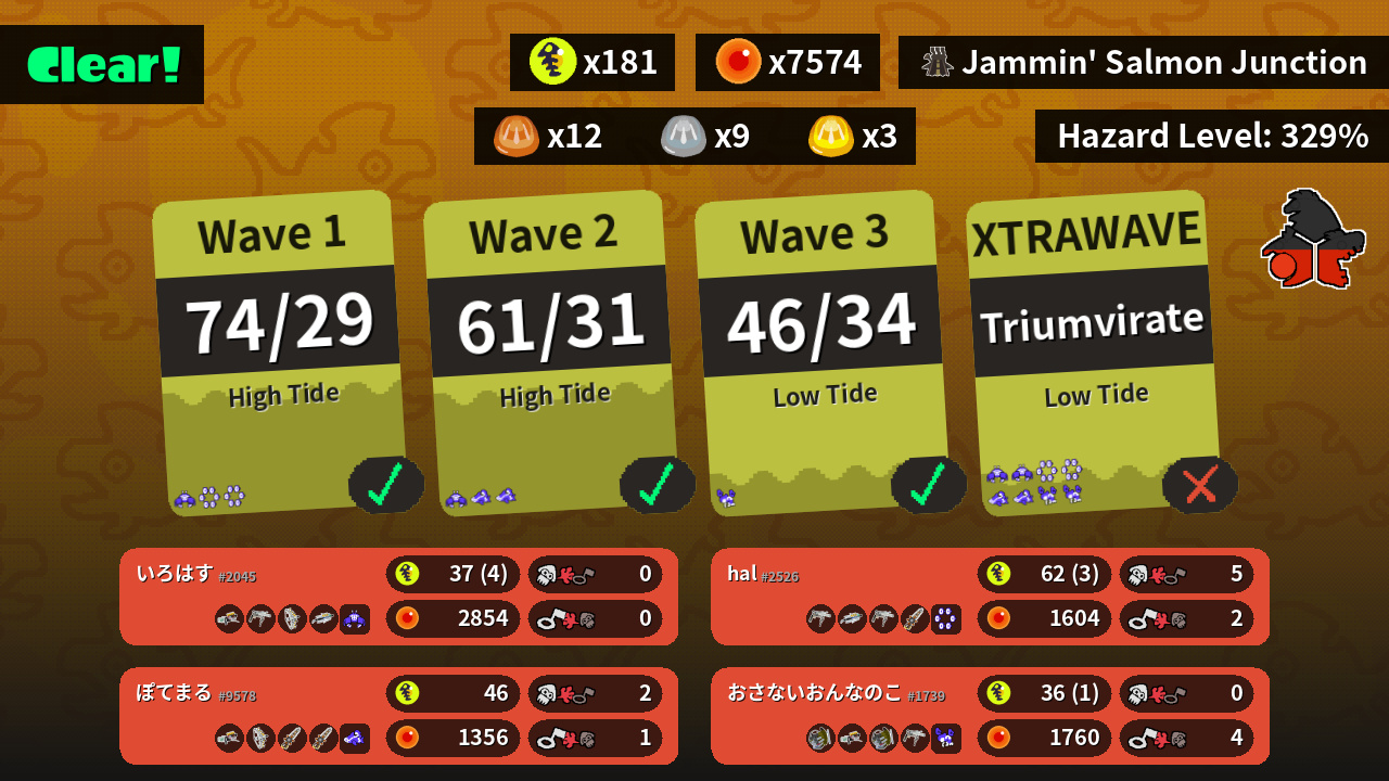 | Weapons | Grizzco Blaster Grizzco Roller Grizzco Stringer Grizzco Brella | Grizzco Roller Grizzco Brella Grizzco Roller Grizzco Splatana | Grizzco Blaster Grizzco Stringer Grizzco Splatana Grizzco Splatana | Grizzco Slosher Grizzco Blaster Grizzco Slosher Grizzco Roller |