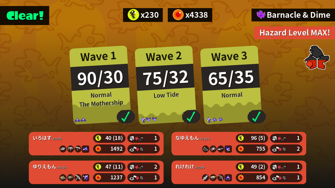 | Weapons | Grizzco Brella Grizzco Roller Carbon Roller | Bloblobber .52 Gal E-liter 4K | Mint Decavitator Splattershot Tenta Brella | Dread Wringer Sploosh-o-matic Splat Brella |
