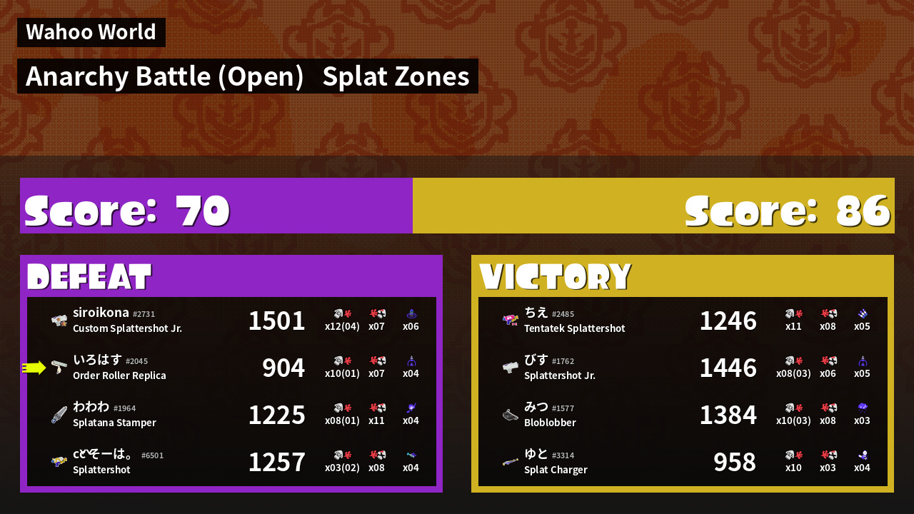 | Mode | Splat Zones - Anarchy Battle (Open) |