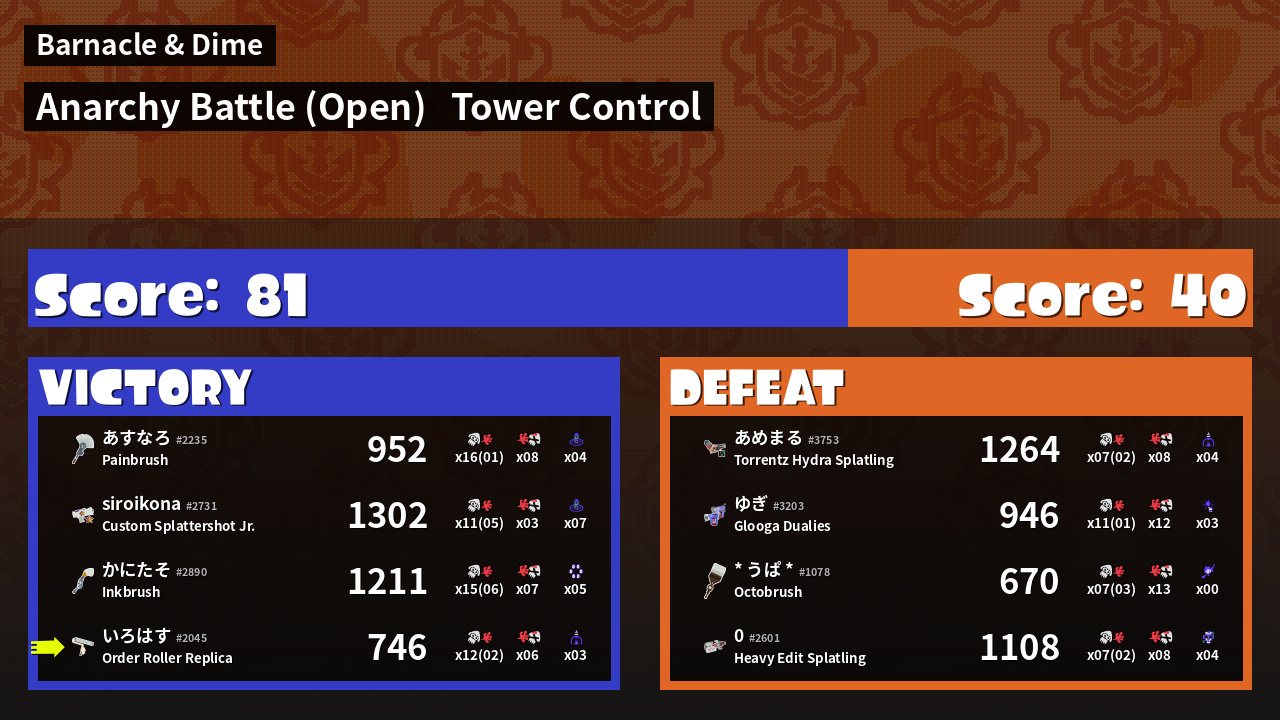 | Mode | Tower Control - Anarchy Battle (Open) |