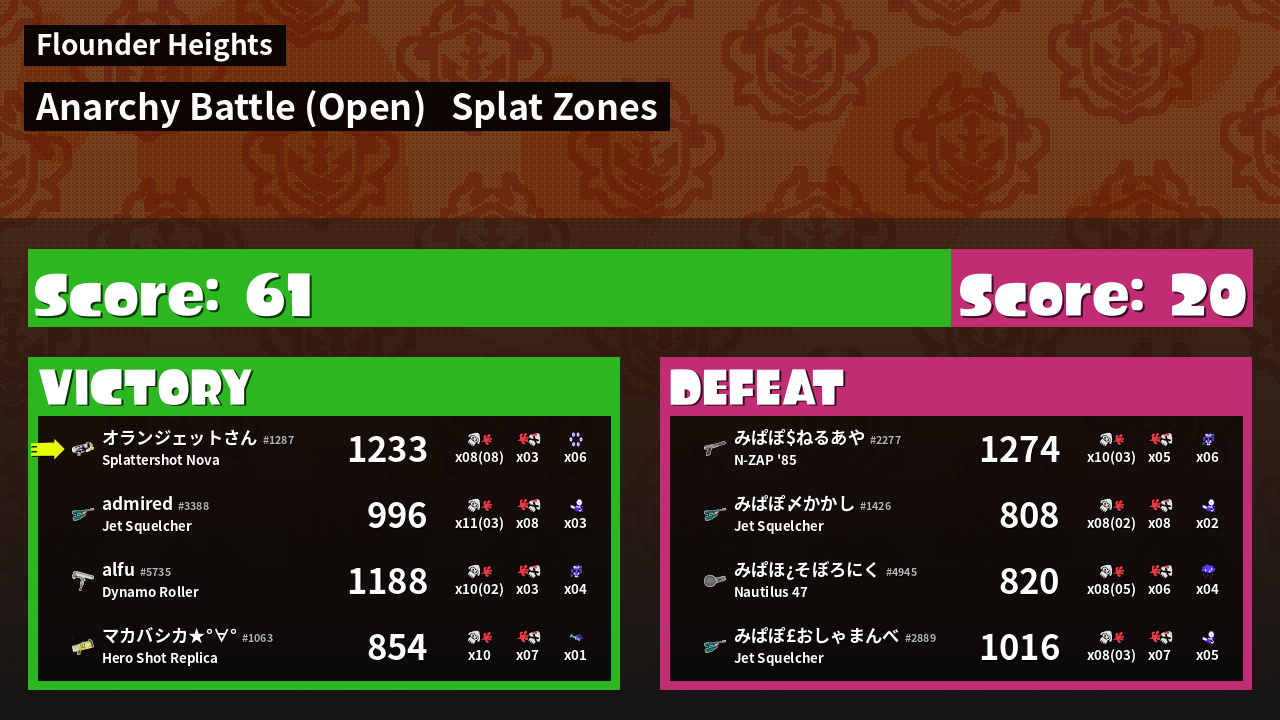 | Mode | Splat Zones - Anarchy Battle (Open) | ||