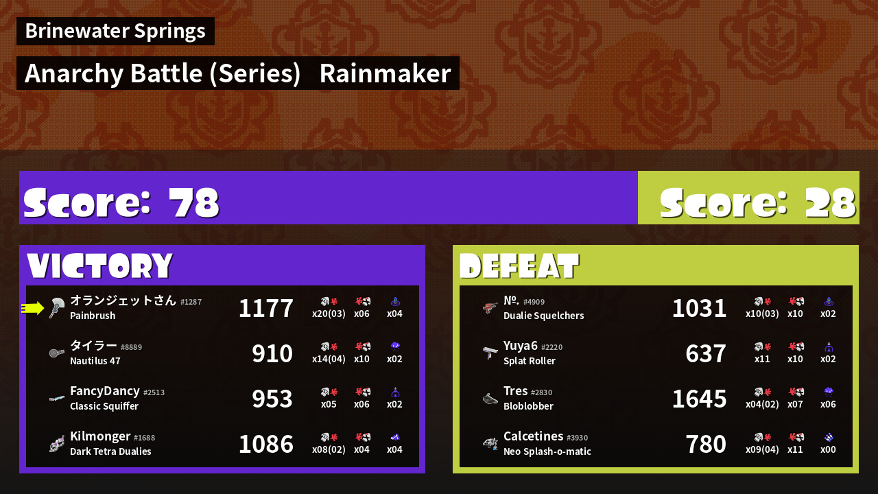 | Medals | #1 Overall Splatter #1 Turf Inker #1 Enemy Splatter | ||