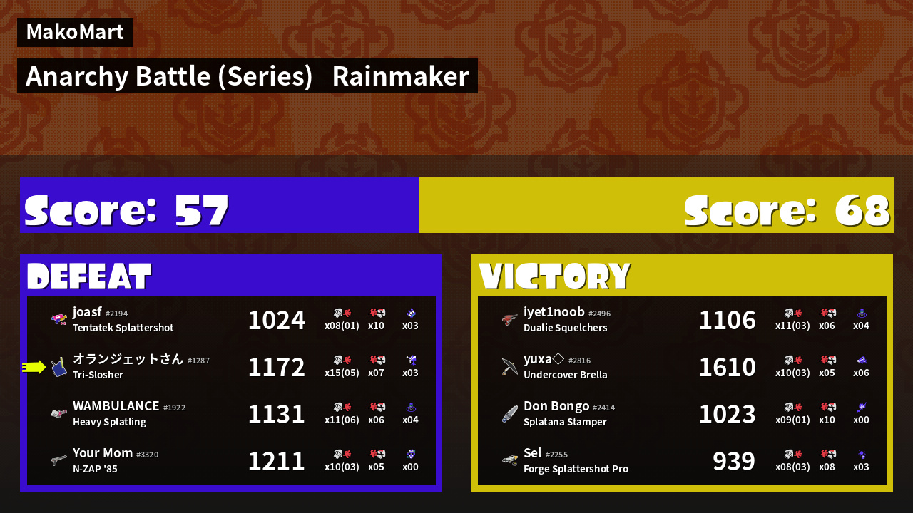 | Medals | #1 Overall Splatter #1 Enemy Splatter #1 Rainmaker Carrier | ||