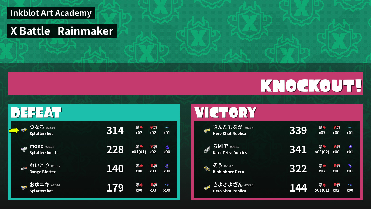 | Medals | #1 Overall Splatter #1 Turf Inker #1 Enemy Splatter | ||