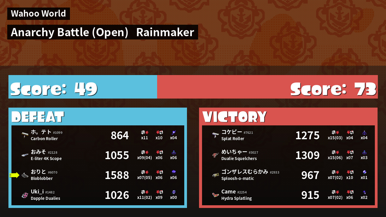 | Medals | #1 Turf Inker #1 Splat Assister #1 Ink Consumer | ||