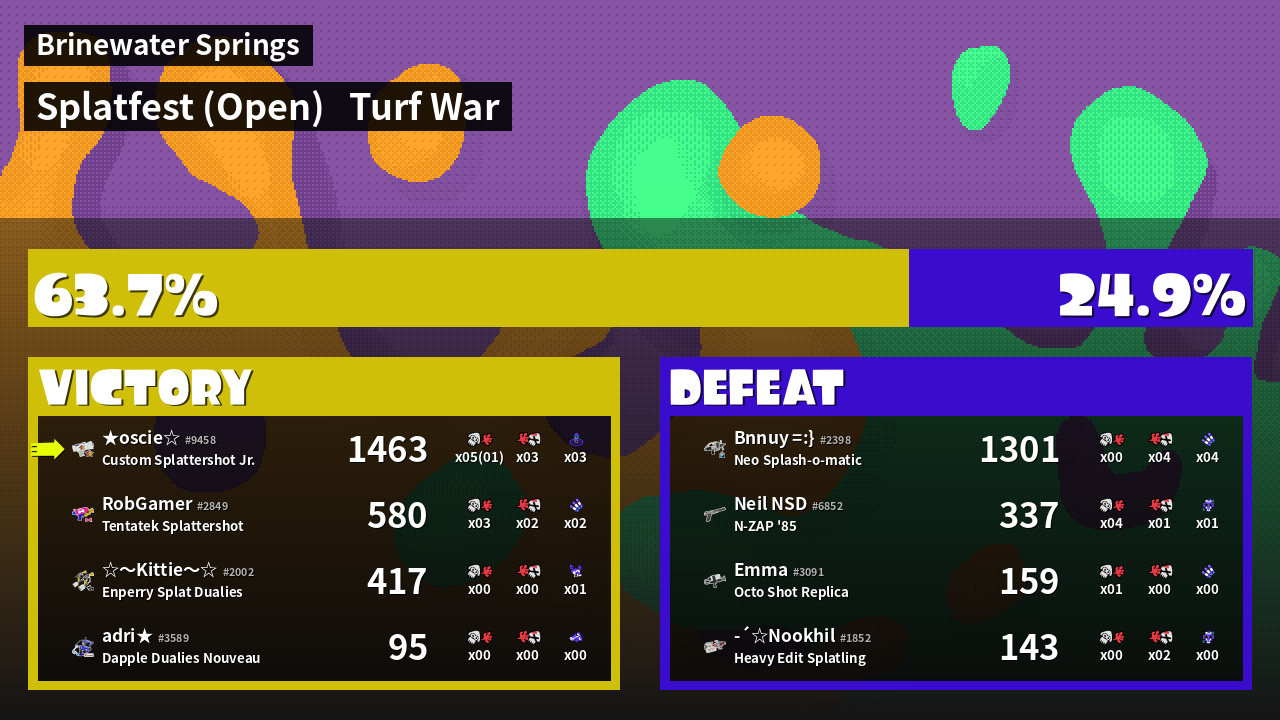 | Medals | #1 Overall Splatter #1 Turf Inker #1 Enemy Splatter | ||