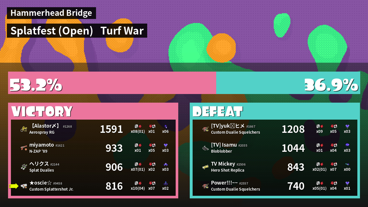 | Medals | #1 Overall Splatter #1 Splat Assister #1 Wave Breaker User | ||