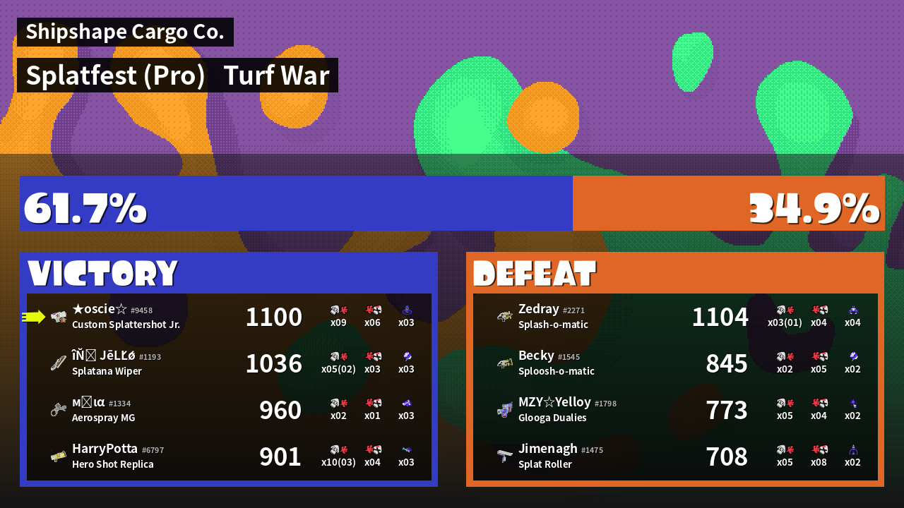 | Medals | #1 Turf Inker #1 Enemy Splatter First Splat! | ||