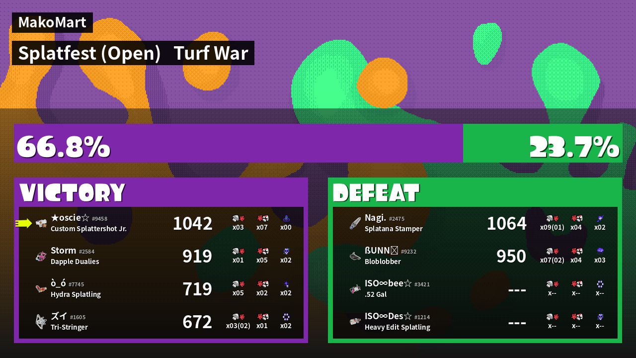 | Medals | #1 Turf Inker #1 Enemy-Base Inker #2 Overall Splatter | ||