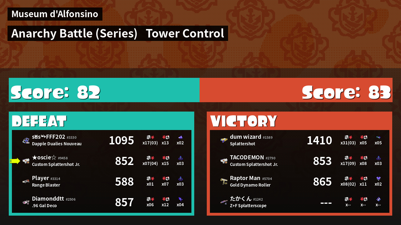 | Medals | #1 Score Booster #1 Splat Assister #1 Checkpoint Breaker | ||
