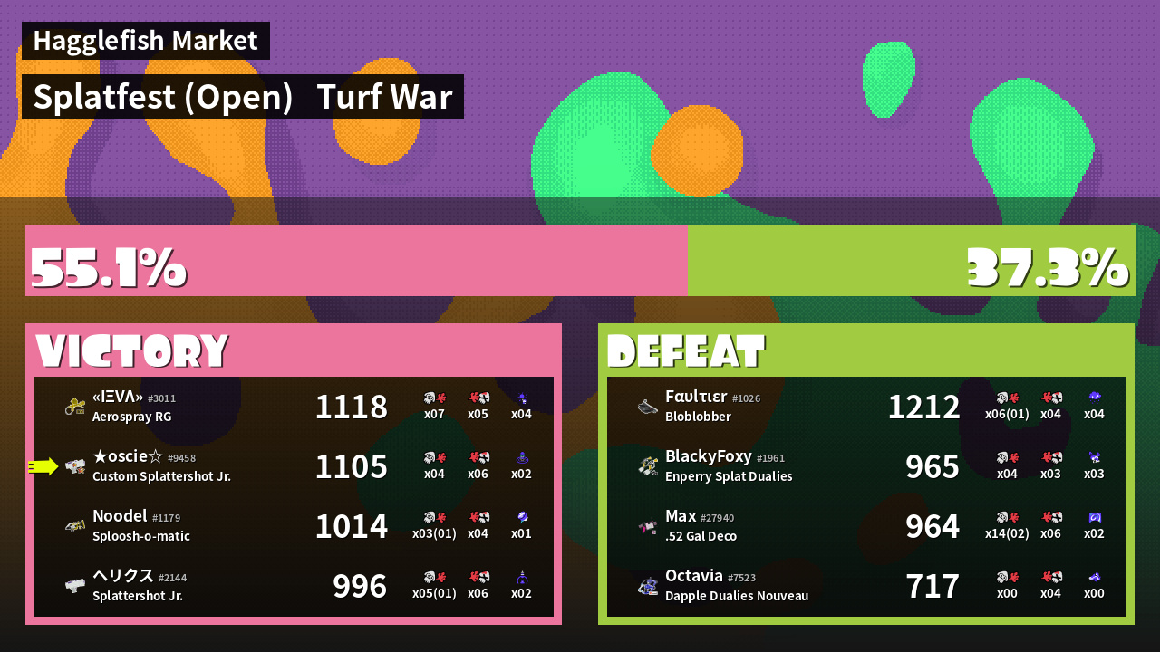 | Medals | #1 Wave Breaker User #2 Turf Inker #2 Enemy Splatter | ||