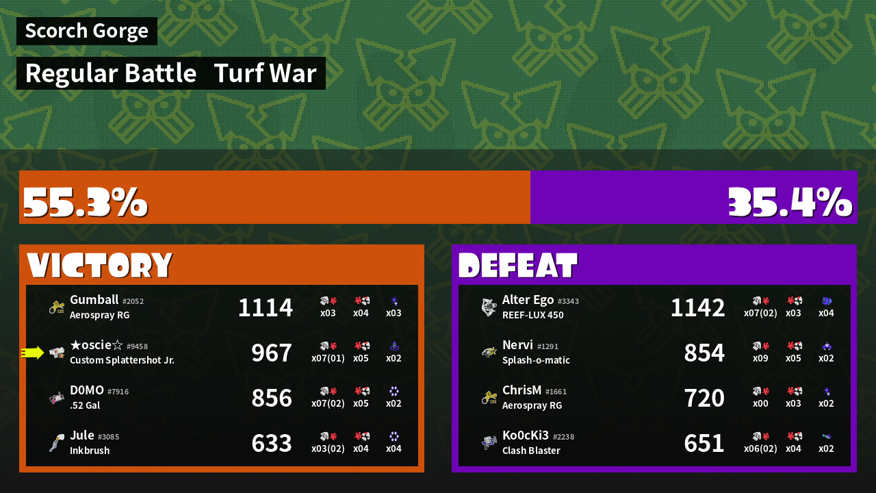 | Medals | #1 Overall Splatter #1 Home-Base Inker #1 Enemy-Base Inker | ||