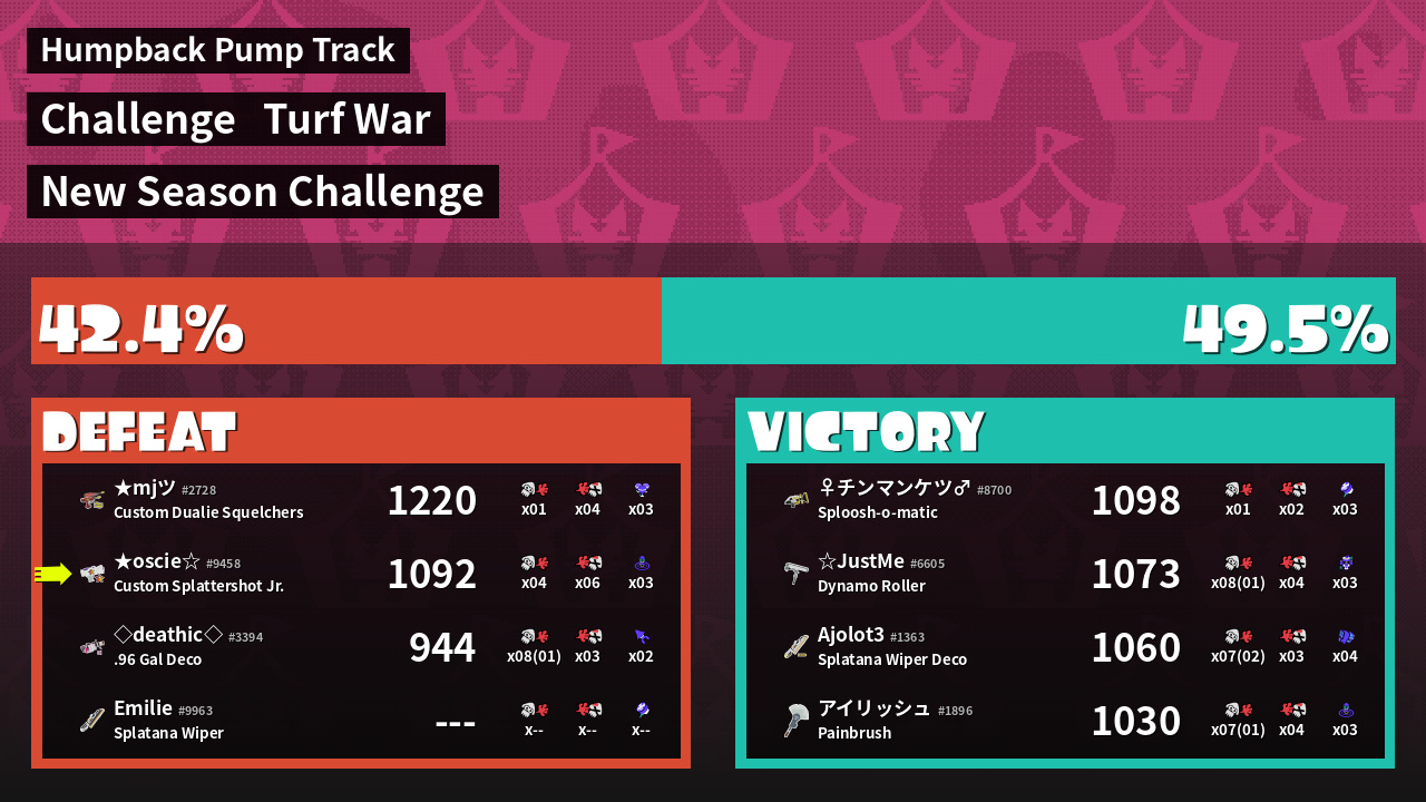 | Medals | #1 Base Defender #1 Wave Breaker User #2 Overall Splatter | ||