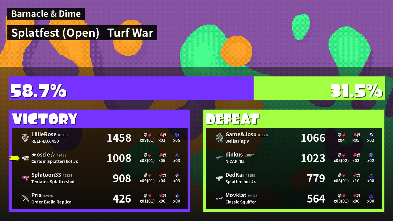 | Medals | #1 Enemy-Base Inker #1 Splat Assister #1 Wave Breaker User | ||