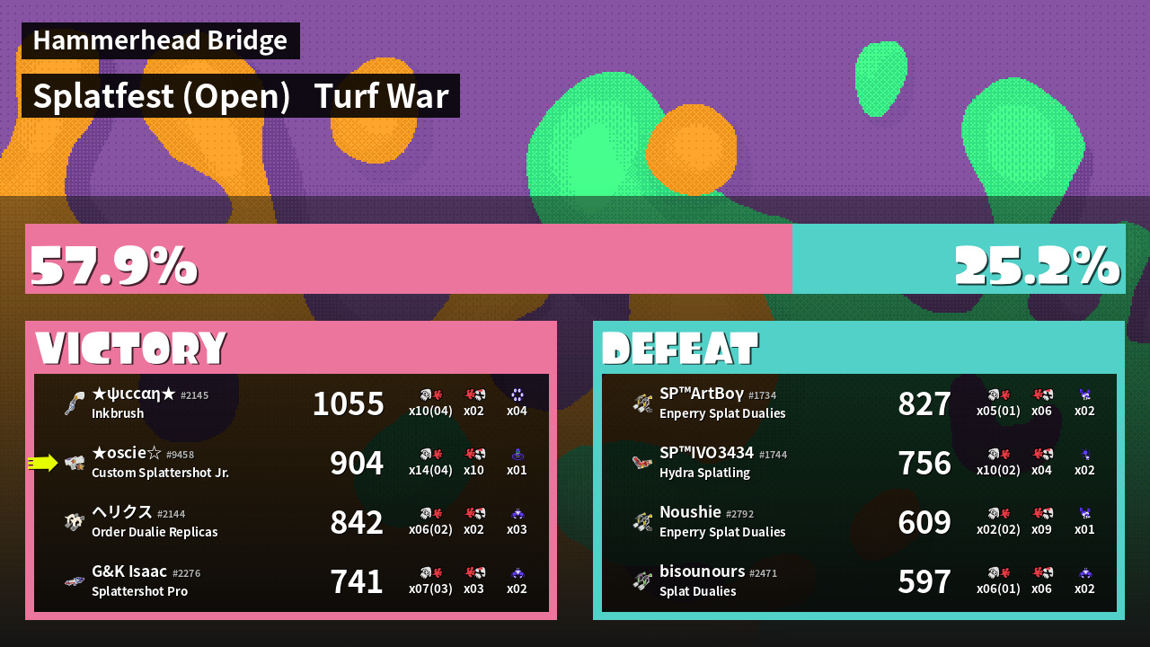| Medals | #1 Overall Splatter #1 Enemy Splatter #1 Splat Assister | ||