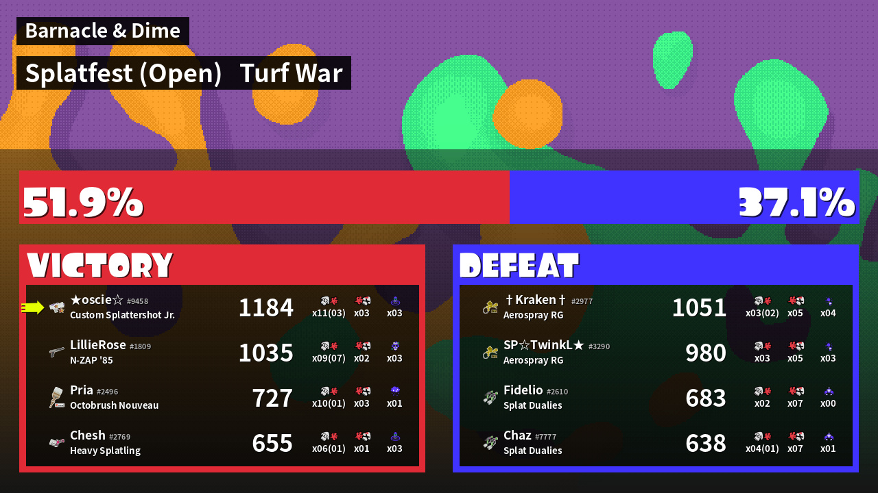 | Medals | #1 Overall Splatter #1 Turf Inker #1 Enemy-Base Inker | ||