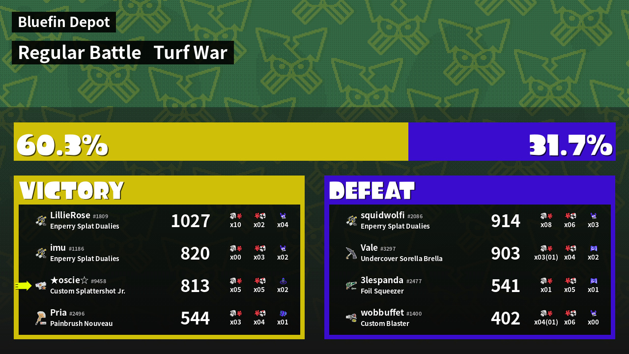 | Medals | #2 Overall Splatter #2 Popular Target #2 Enemy-Base Inker | ||