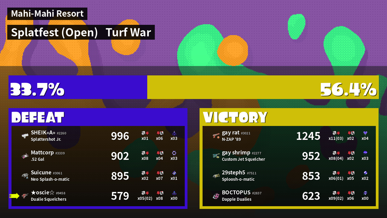 | Medals | #1 Splat Assister #1 Ground Traveler #2 Overall Splatter | ||