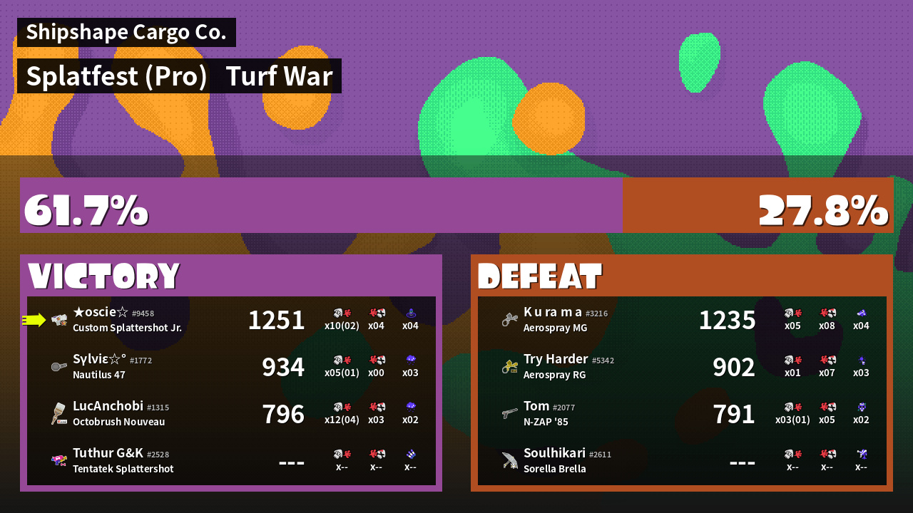 | Medals | #1 Turf Inker #1 Enemy-Base Inker #1 Enemy Splatter | ||