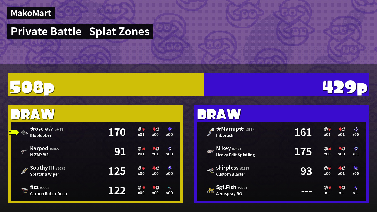 | Mode | Splat Zones - Private Battle | ||