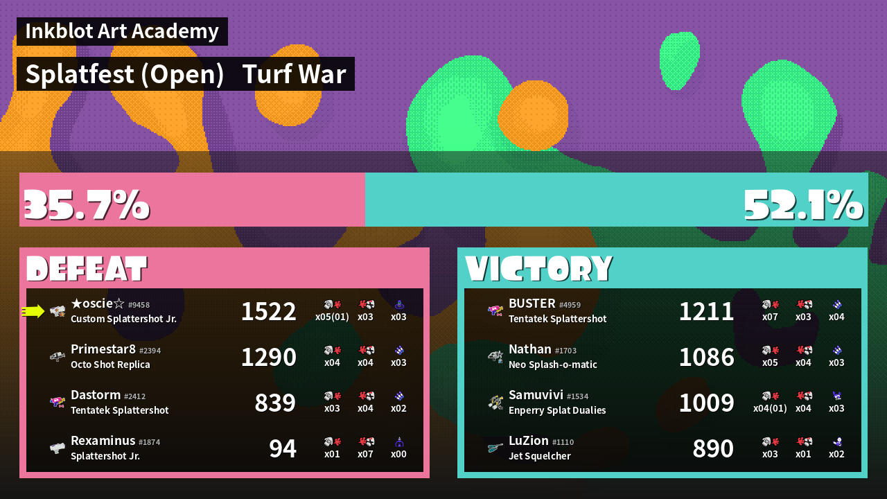| Medals | #1 Overall Splatter #1 Turf Inker #1 Enemy-Base Inker | ||