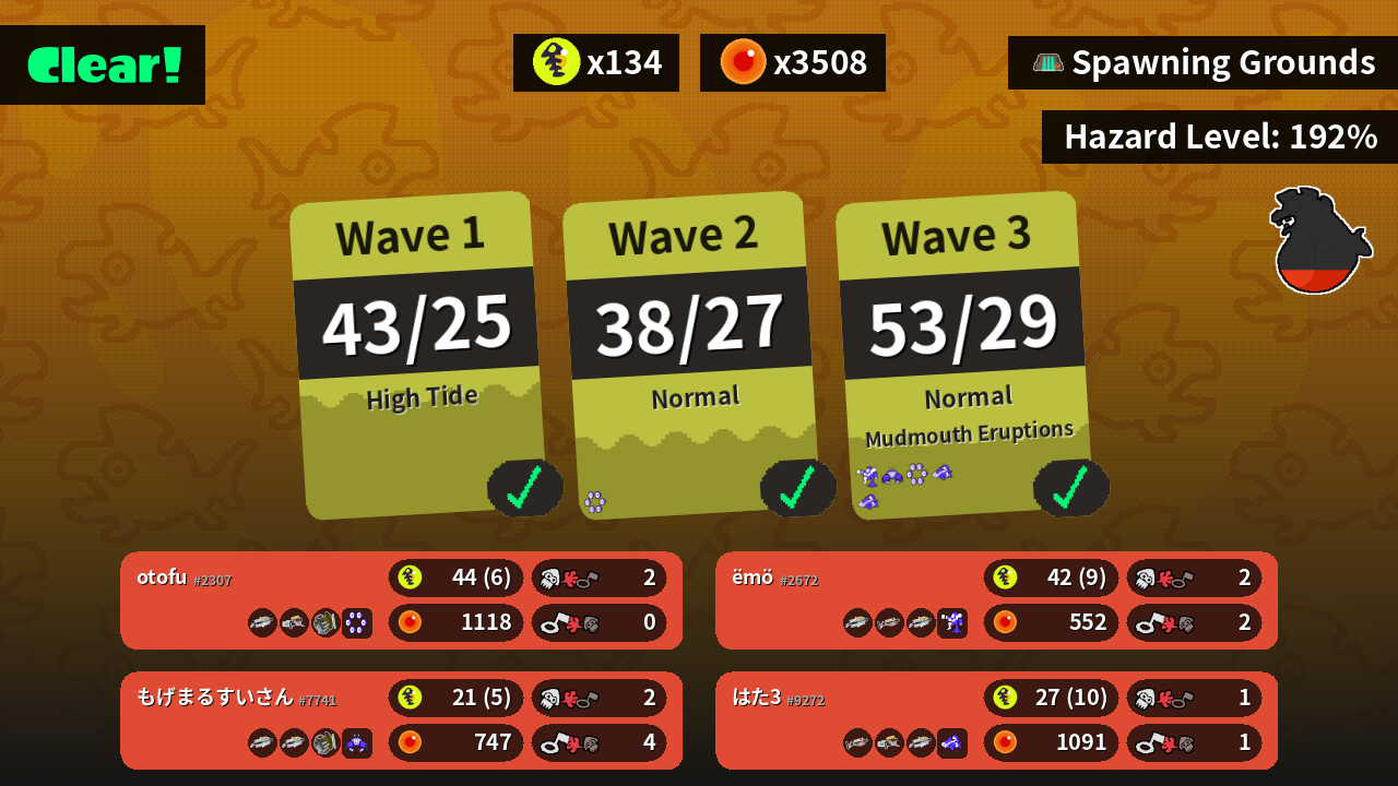 | Weapons | Grizzco Brella Grizzco Blaster Grizzco Slosher | Grizzco Brella Grizzco Charger Grizzco Brella | Grizzco Charger Grizzco Blaster Grizzco Brella | Grizzco Brella Grizzco Brella Grizzco Slosher |