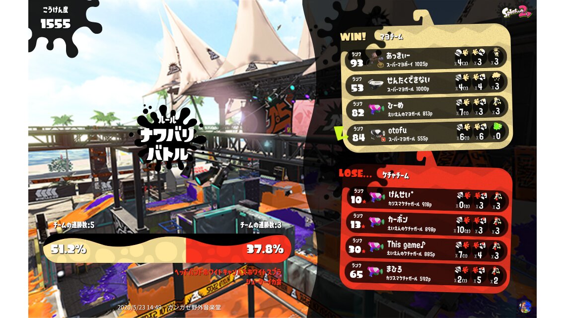 | Team ケチャ ヘッドバンドホワイトキャンバスホワイトスプラシューターイカ会 Win Streak: 3 | 3,293 | 15 / 15 | 1.00 50.00% | ||||