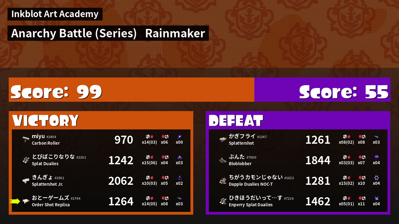 | Medals | #1 Trizooka User #2 Overall Splatter #2 Turf Inker | ||
