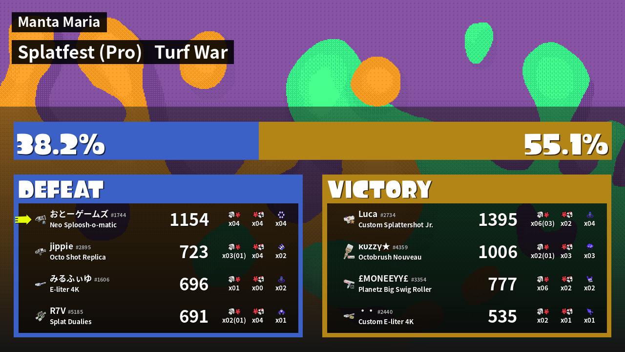 | Medals | #1 Overall Splatter #1 Turf Inker #1 Enemy-Base Inker | ||