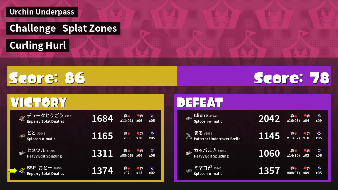 | Weapon | Enperry Splat Dualies ( Curling Bomb / Triple Splashdown) | ||