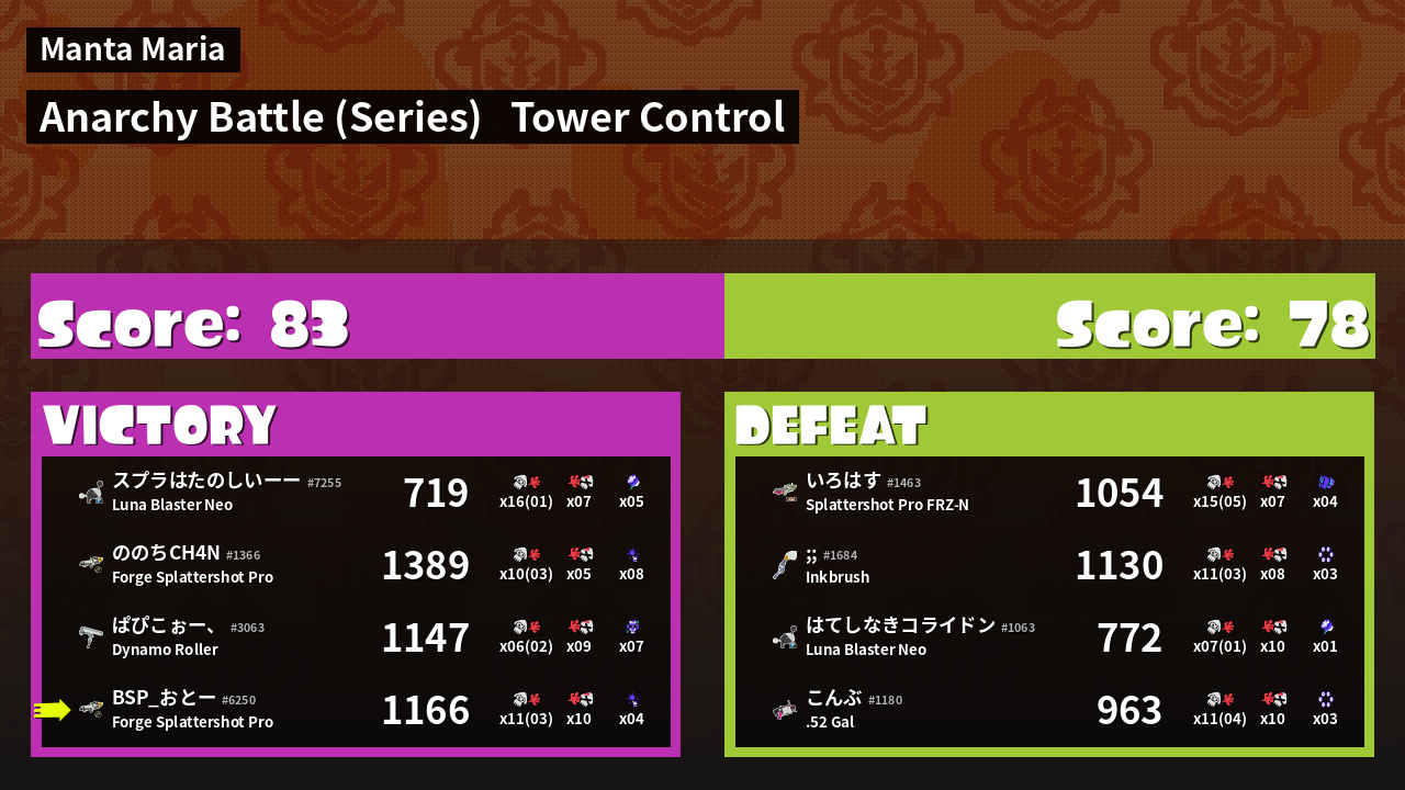 | Medals | #1 Splat Assister #1 Tower Stopper #1 Booyah Bomb User | ||