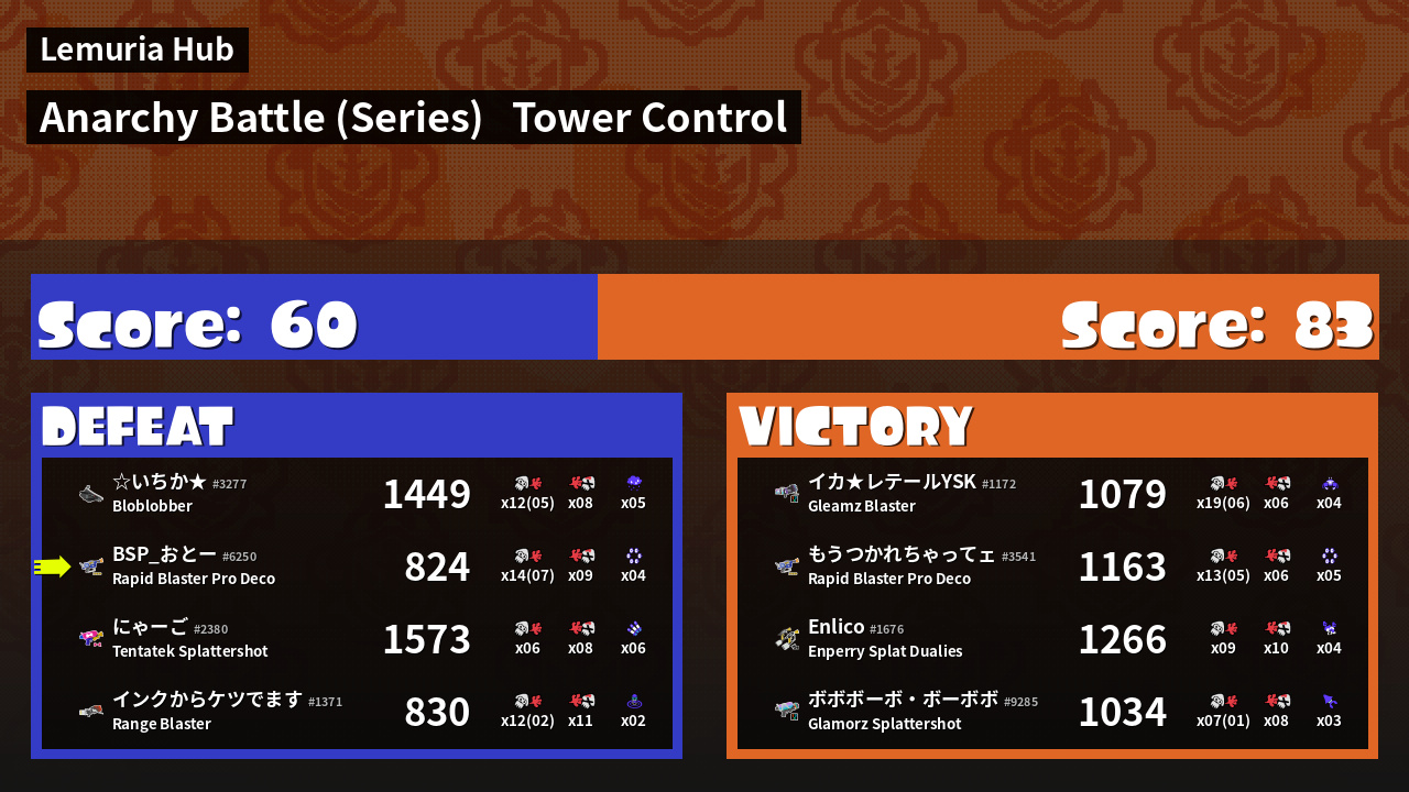 | Medals | #1 Overall Splatter #1 Splat Assister #1 Tower Stopper | ||