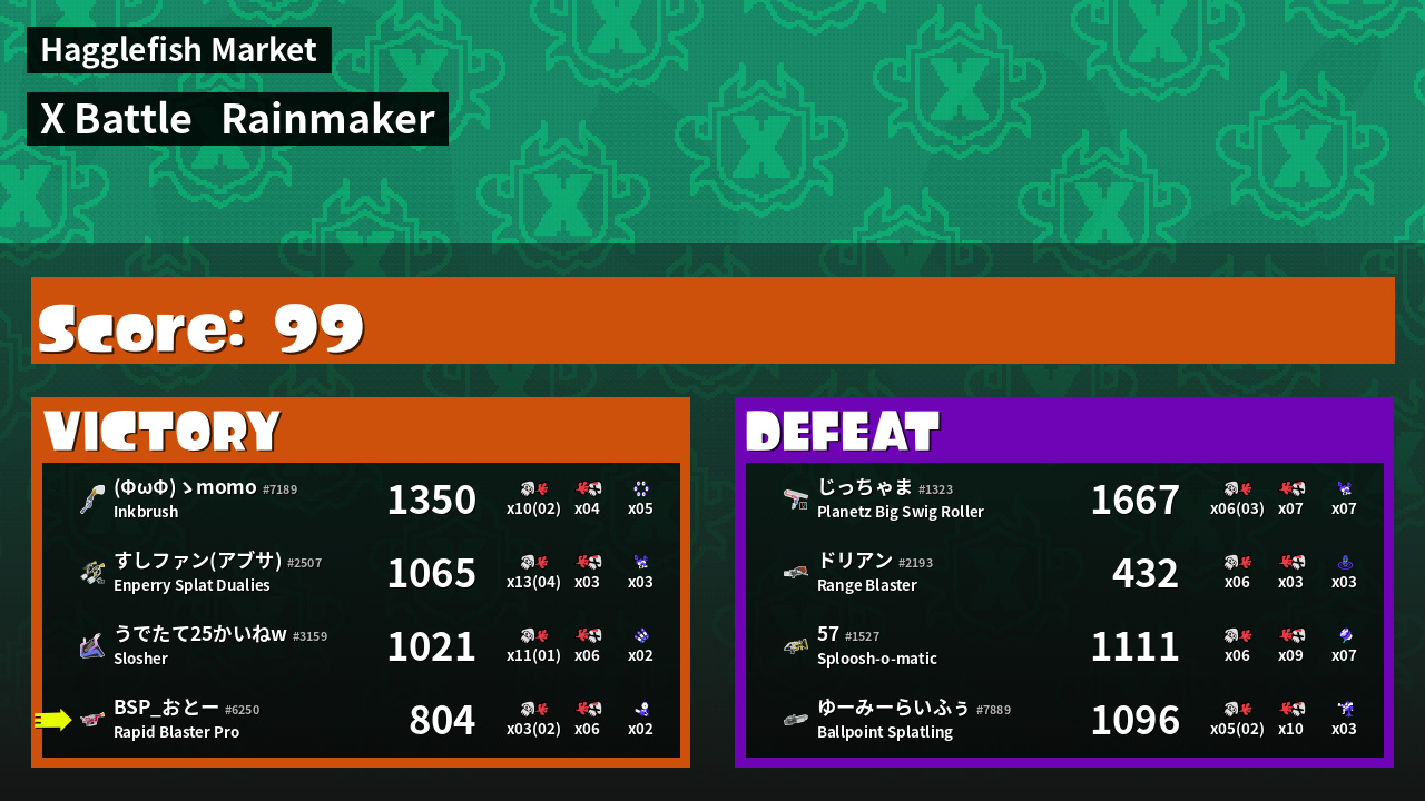| Medals | #1 Score Booster #1 Rainmaker Carrier #2 Splat Assister | ||