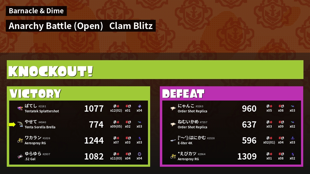 | Medals | #1 Score Booster #1 Clam Carrier #1 Splat Assister |