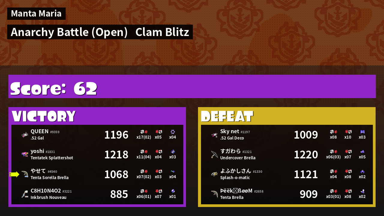 | Mode | Clam Blitz - Anarchy Battle (Open) |