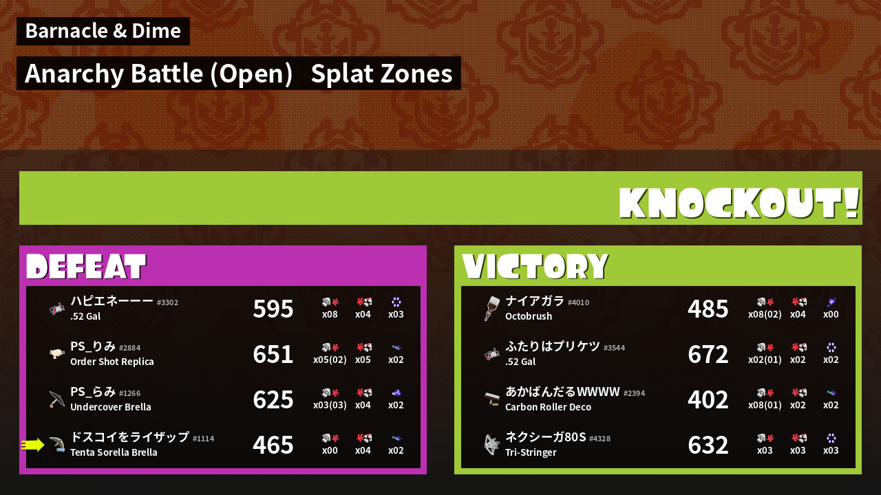 | Mode | Splat Zones - Anarchy Battle (Open) |