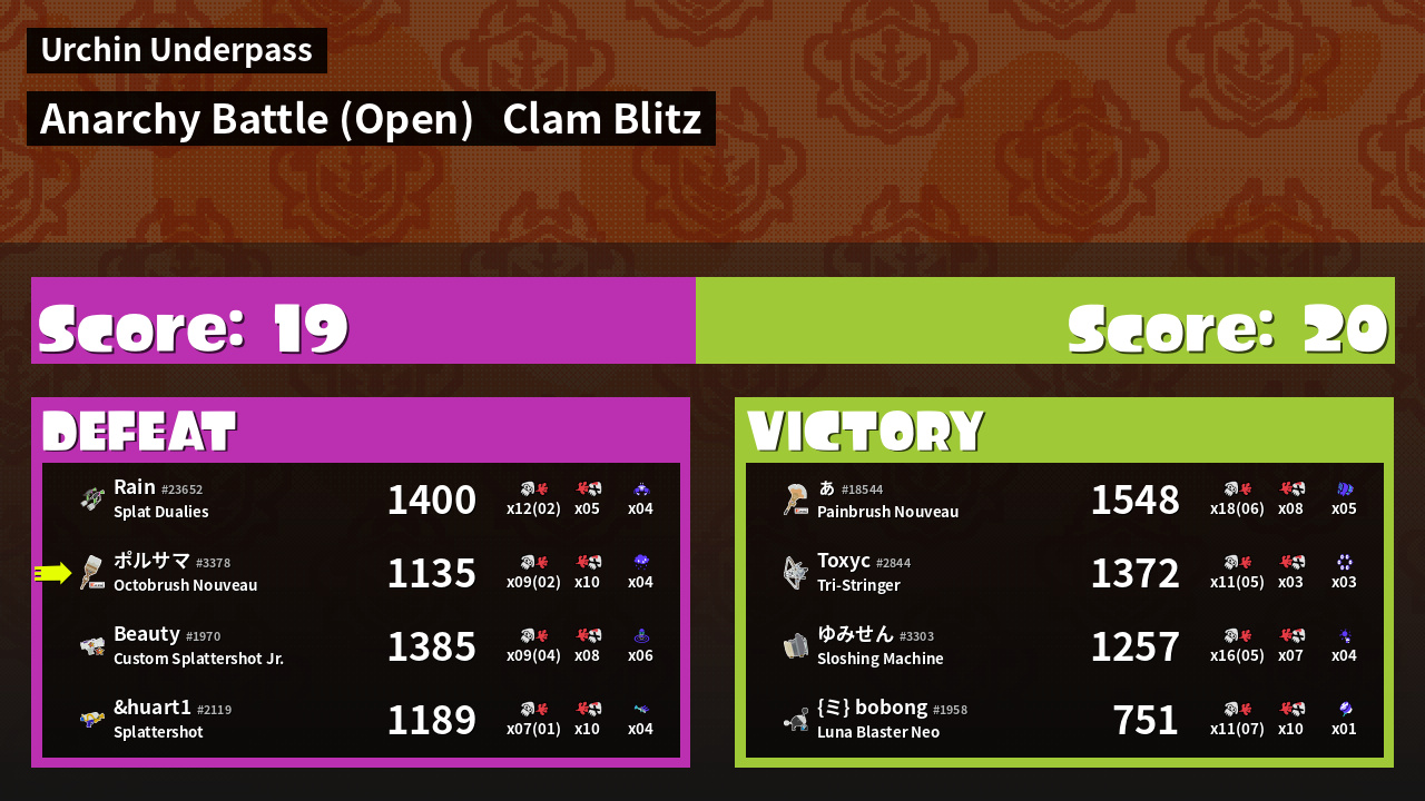 | Mode | Clam Blitz - Anarchy Battle (Open) | ||