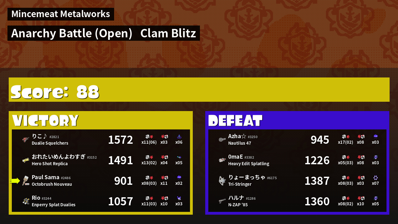 | Mode | Clam Blitz - Anarchy Battle (Open) | ||