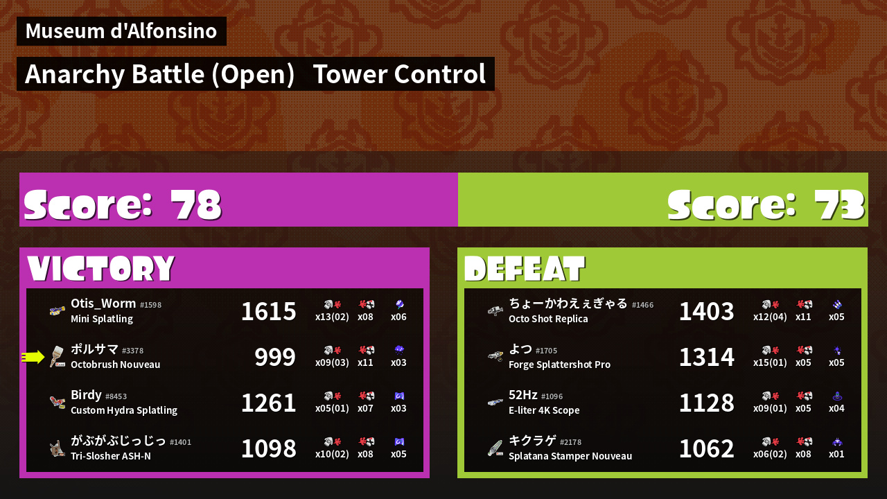 | Medals | #1 Super Jump Spot #1 Splat Assister #1 Tower Stopper | ||
