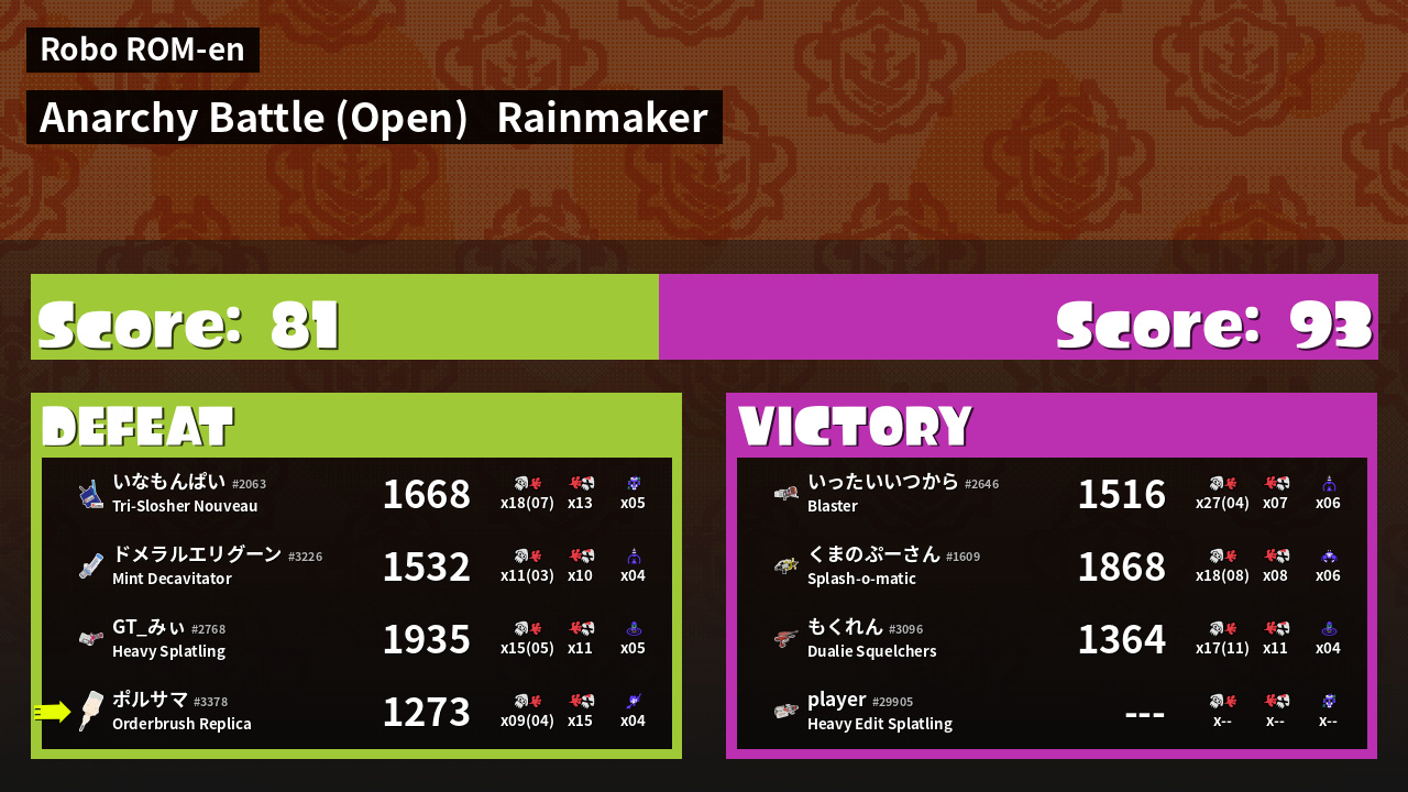 | Mode | Rainmaker - Anarchy Battle (Open) | ||