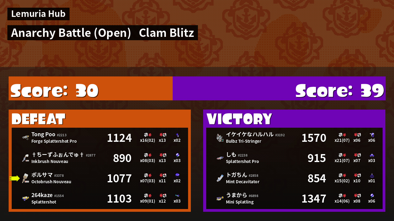 | Mode | Clam Blitz - Anarchy Battle (Open) | ||