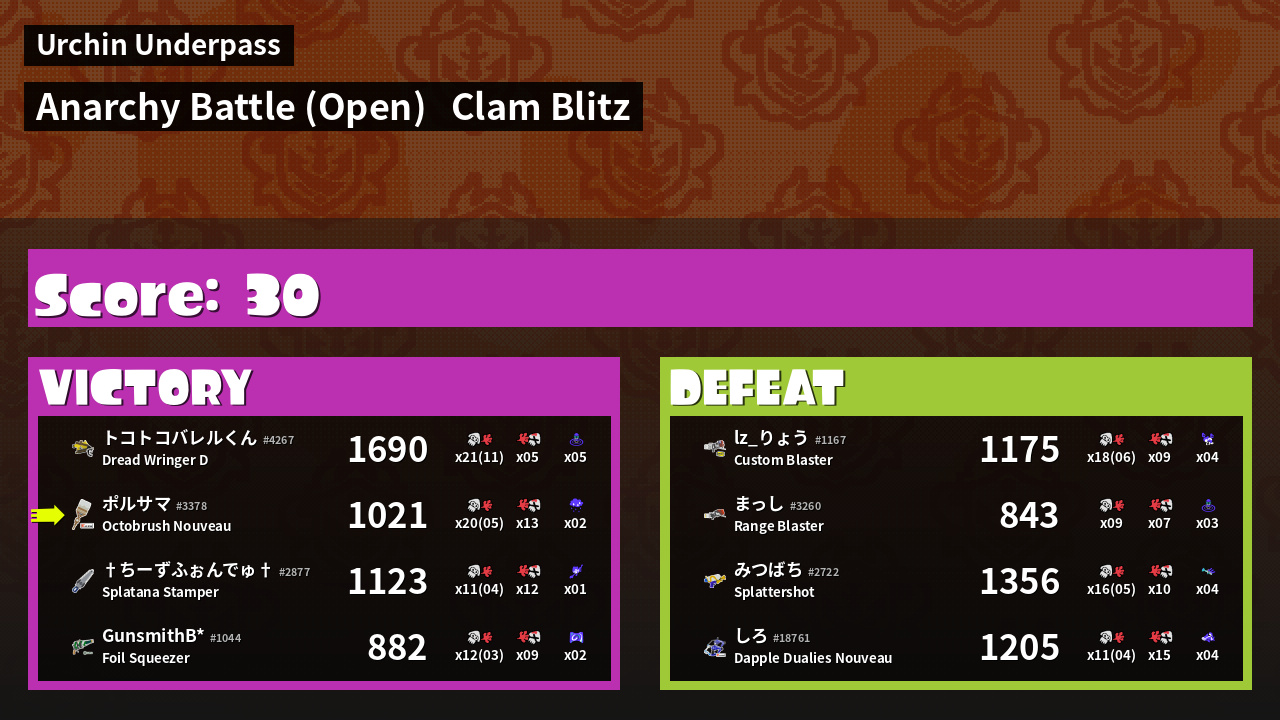 | Mode | Clam Blitz - Anarchy Battle (Open) | ||
