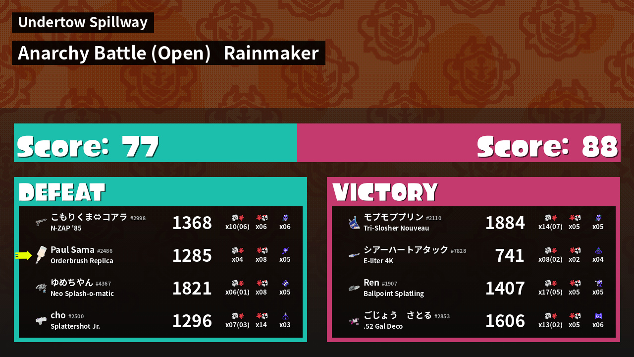 | Medals | #1 Damage Taker #1 Big Bubbler User #2 Overall Splatter | ||