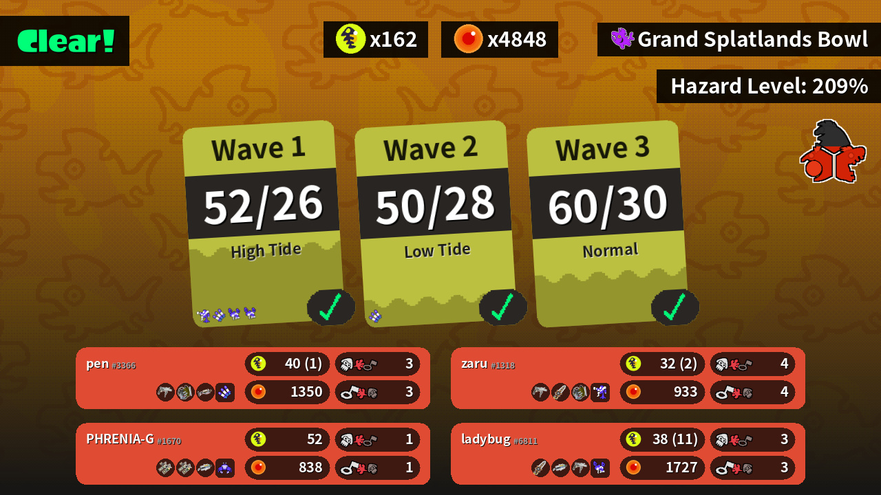 | Weapons | Grizzco Roller Grizzco Slosher Grizzco Charger | Grizzco Dualies Grizzco Dualies Grizzco Brella | Grizzco Splatana Grizzco Brella Grizzco Roller | Grizzco Roller Grizzco Splatana Grizzco Slosher |
