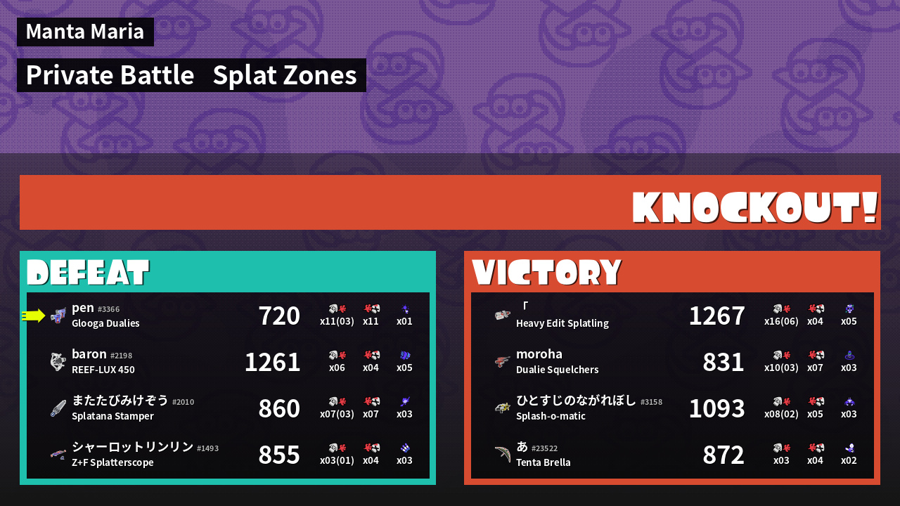 | Mode | Splat Zones - Private Battle | ||