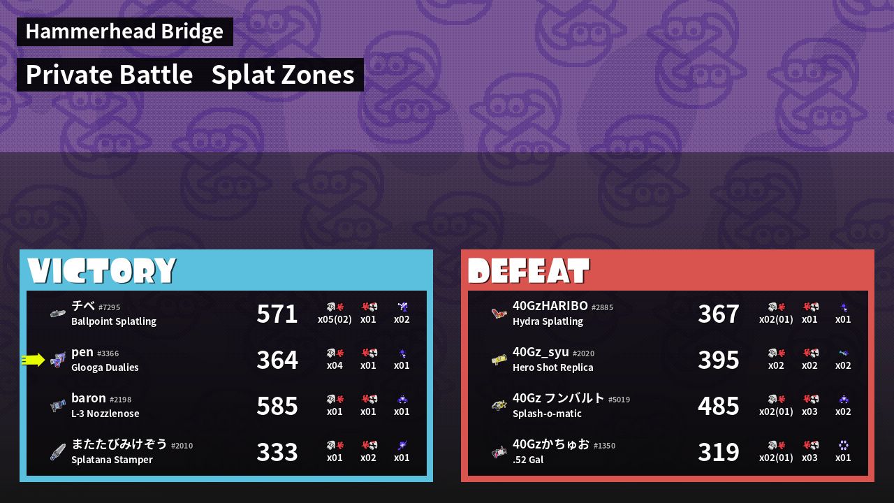 | Mode | Splat Zones - Private Battle | ||