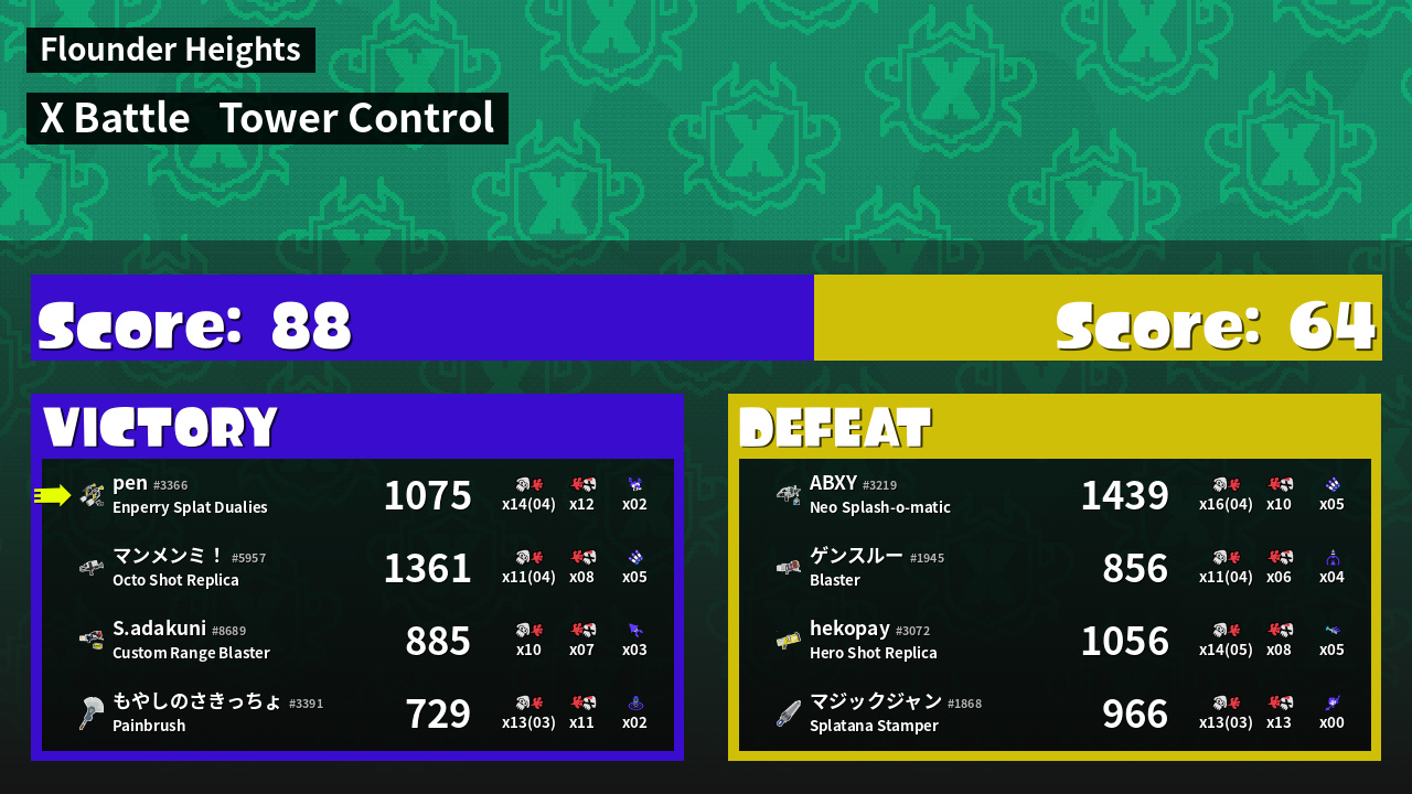 | Weapon | Enperry Splat Dualies ( Curling Bomb / Triple Splashdown) | ||