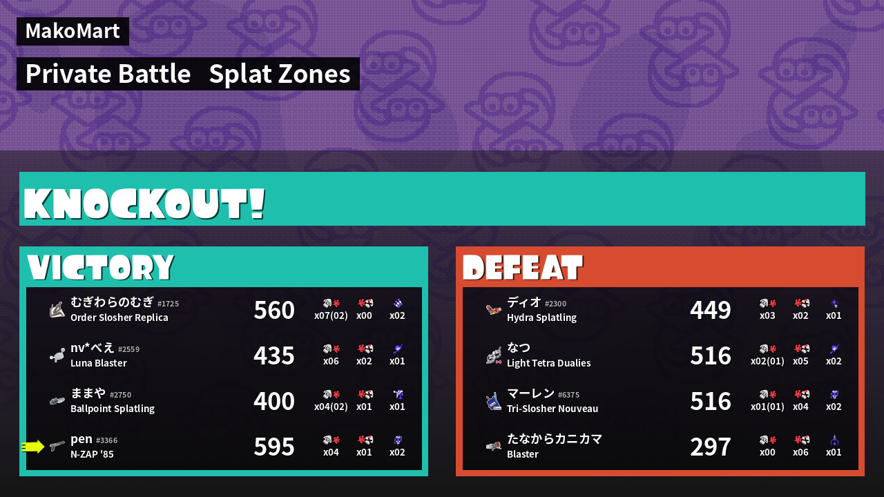 | Mode | Splat Zones - Private Battle | ||