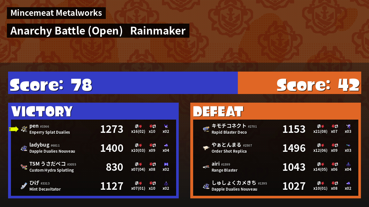 | Weapon | Enperry Splat Dualies ( Curling Bomb / Triple Splashdown) | ||