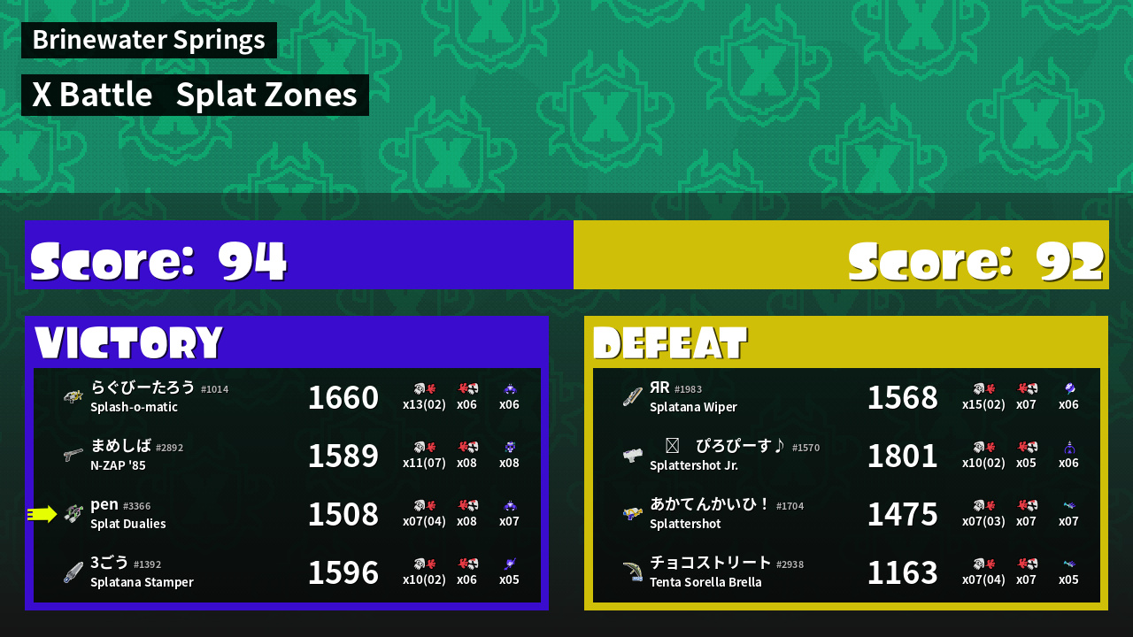 | Medals | #1 Super Jump Spot #1 Ink Consumer #2 Splat Zone Inker | ||